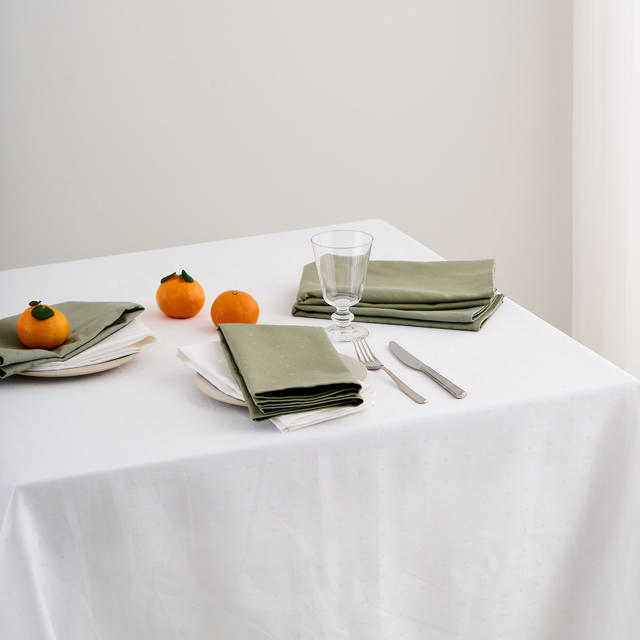 Skab kontrast med friske orange klementiner på en hvid Sofia dug. Sofia servietterne i 3 farver gør bordet komplet